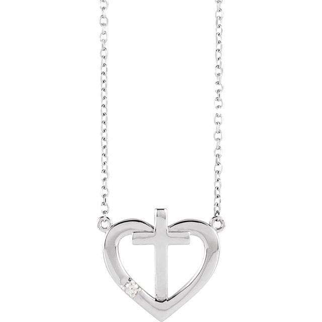 14K White .015 CT Natural Diamond Heart & Cross 18″ Necklace