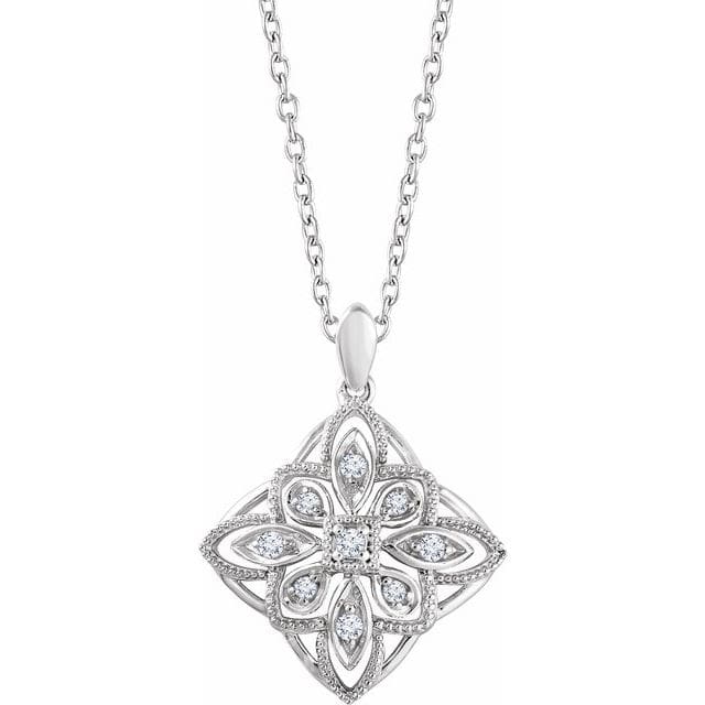 14K White 1/10 CTW Natural Diamond Granulated Filigree 16-18″ Necklace