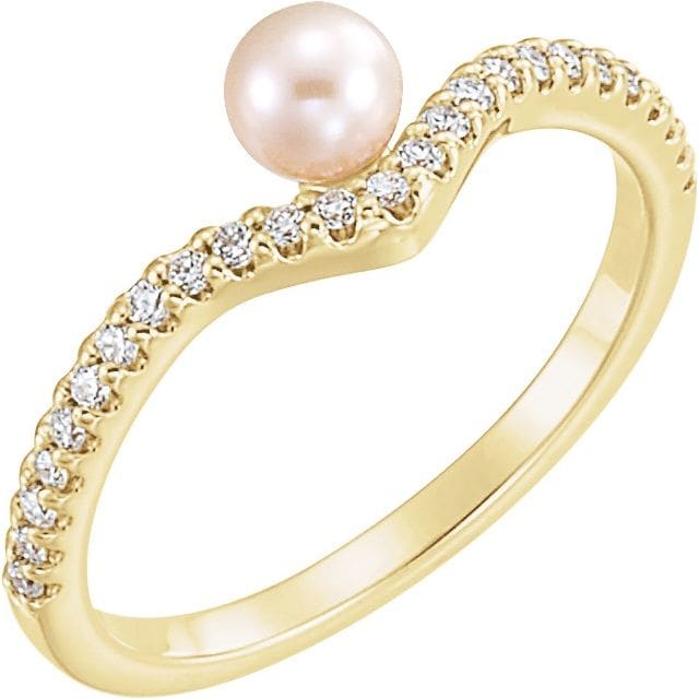 14K Yellow Cultured White Freshwater Cultured Pearl & 1/6 CTW Natural Diamond V Ring