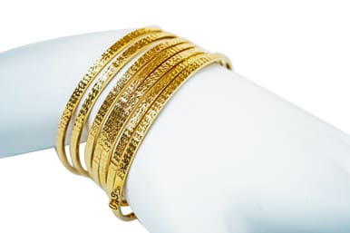 Flexible, bendable bracelets have deep lustrous gold colors. For every day or occasional use.