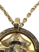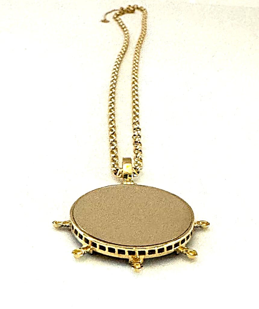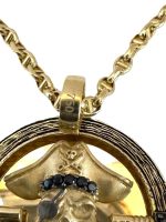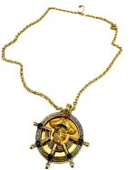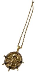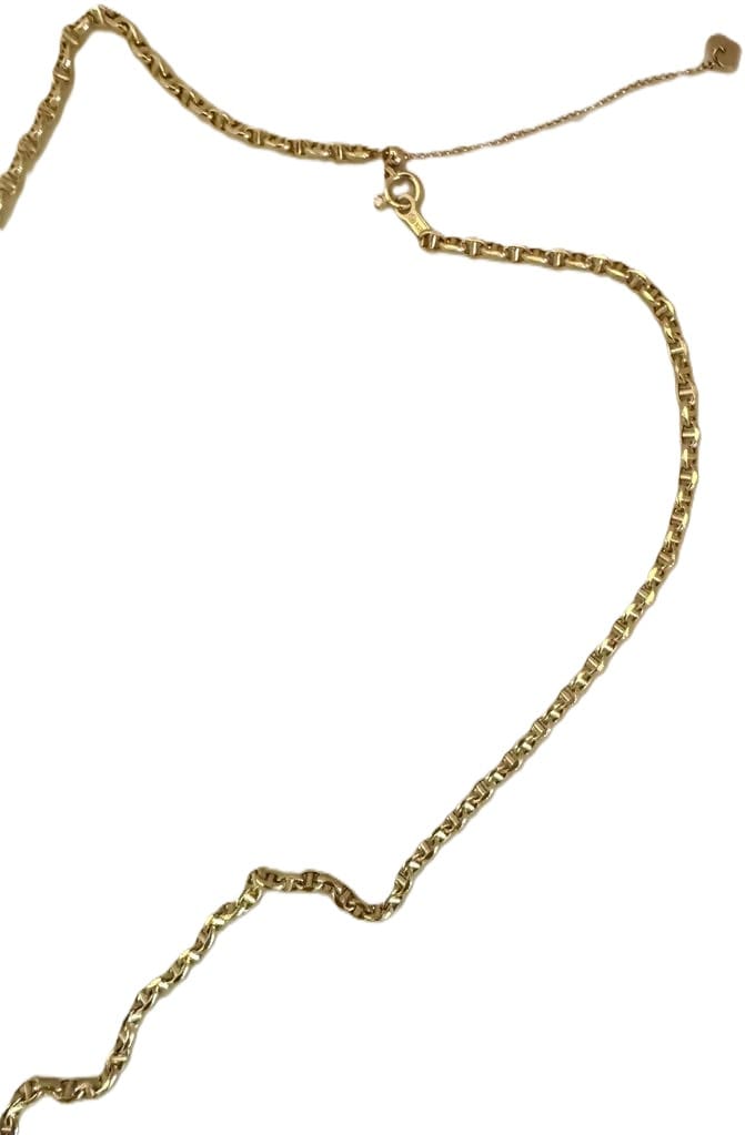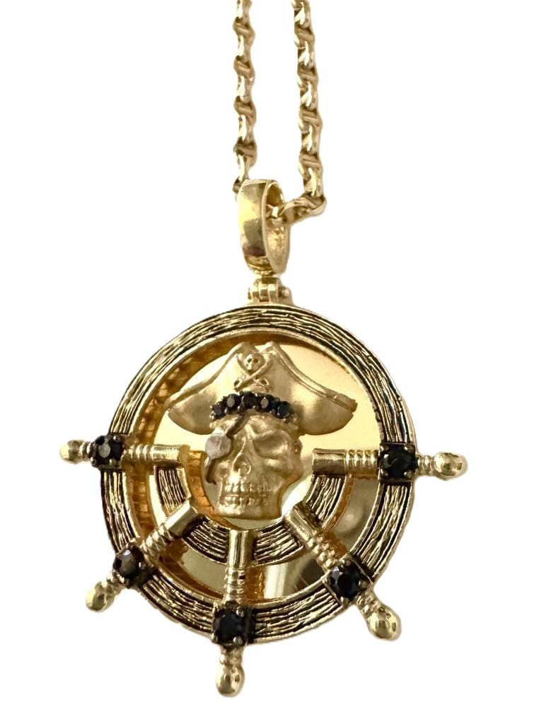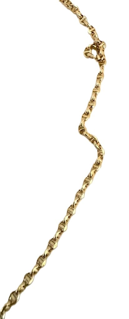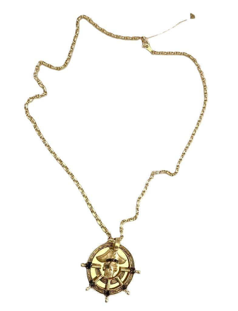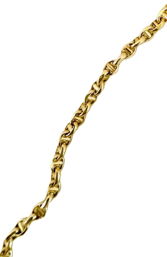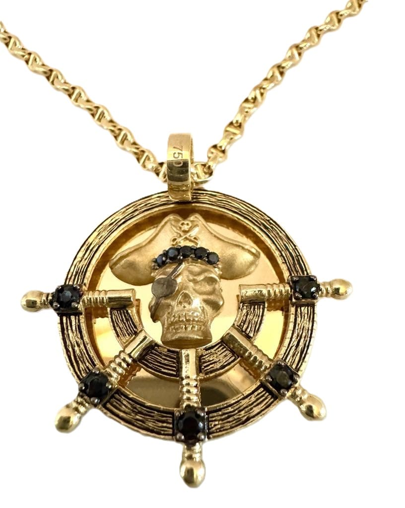 This pirate/anchor design necklace sets in beautifully in high polished 18k solid yellow-gold. This has a weight of 17.4 grams, and length of 18 inches mariner chain, plus a 1 1/2 inch extension. Stamped 18k (means 75% gold)