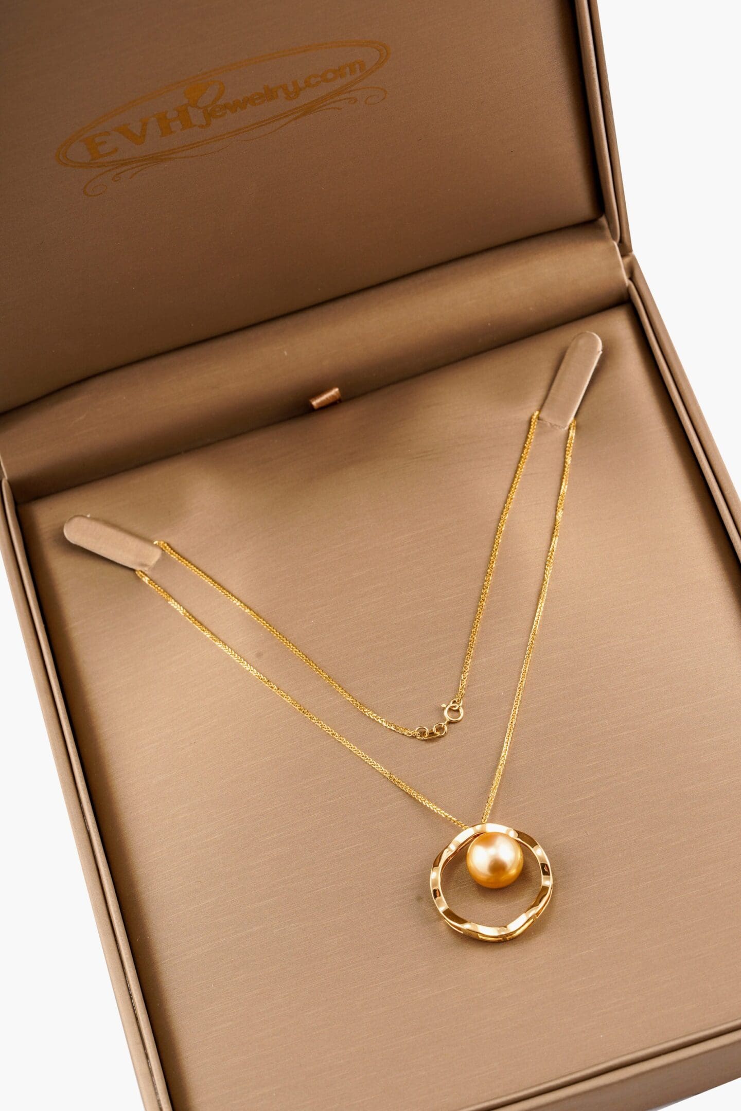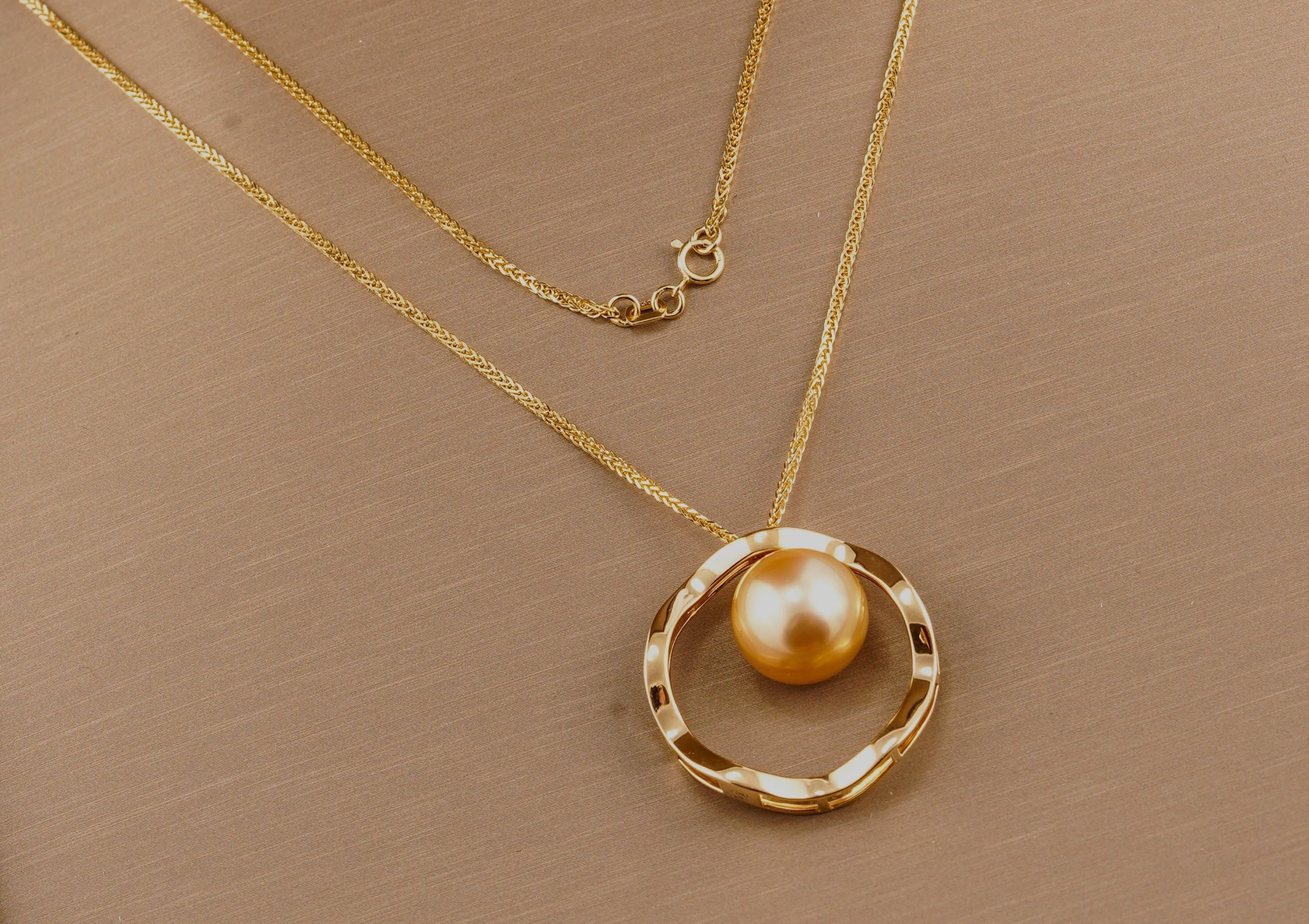 Lustrous, organic, classic. This Golden South Sea Pearl necklace stands out in color. Set in 18k yellow-gold, this elegant necklace features a 12.64 mm solitaire button pearl.