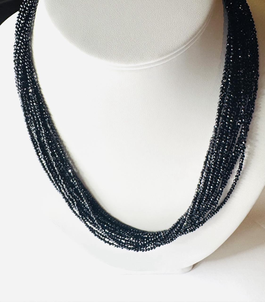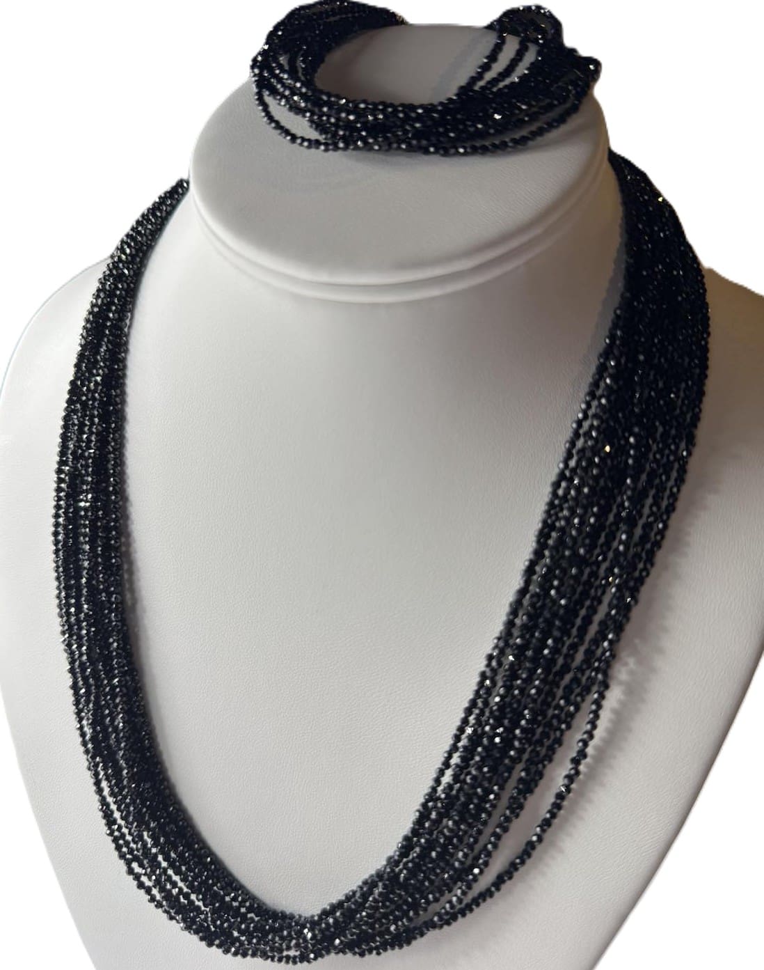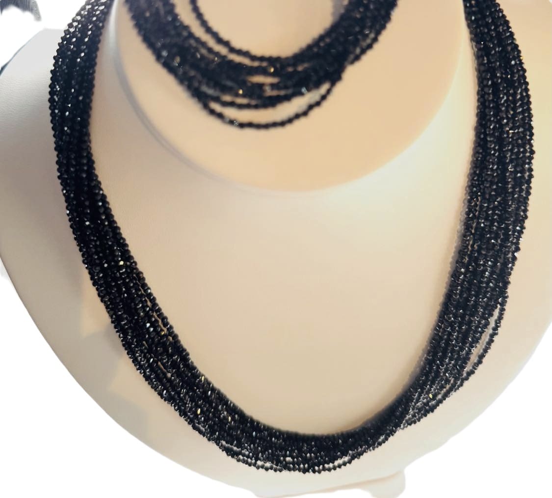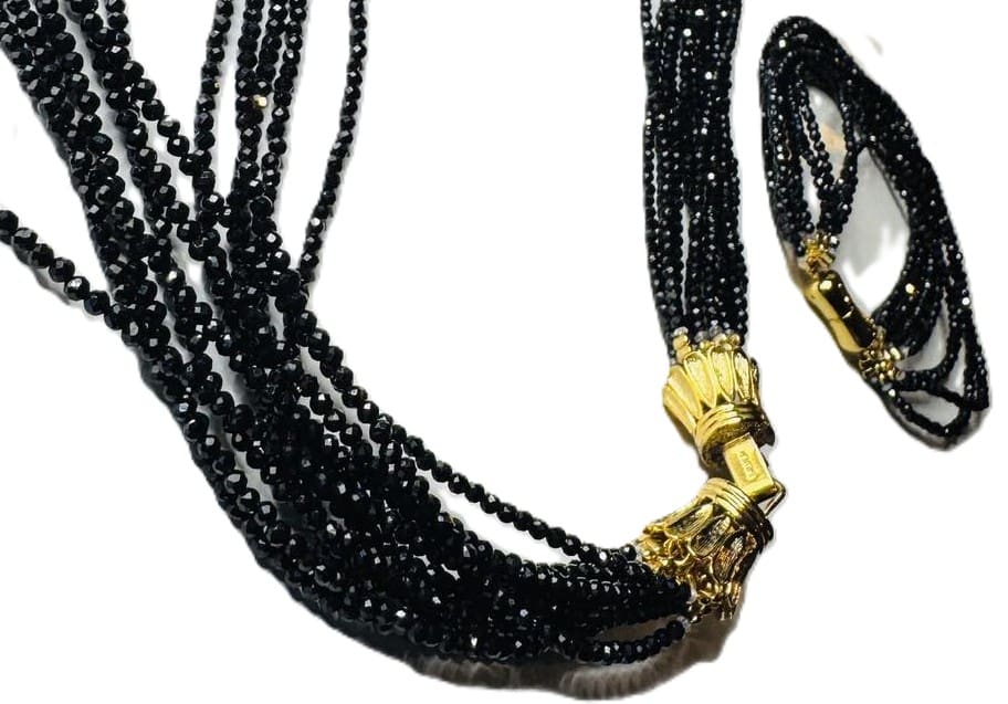 Beautifully bold, necklace features an impressive show of a whole black spinel 10/12 strands that add drama to any outfit. Set in sterling silver with gold plating. This necklace has French backing that could be worn in front. Necklace length is 20.5 inches, bracelet has magnetic closure , size 7.