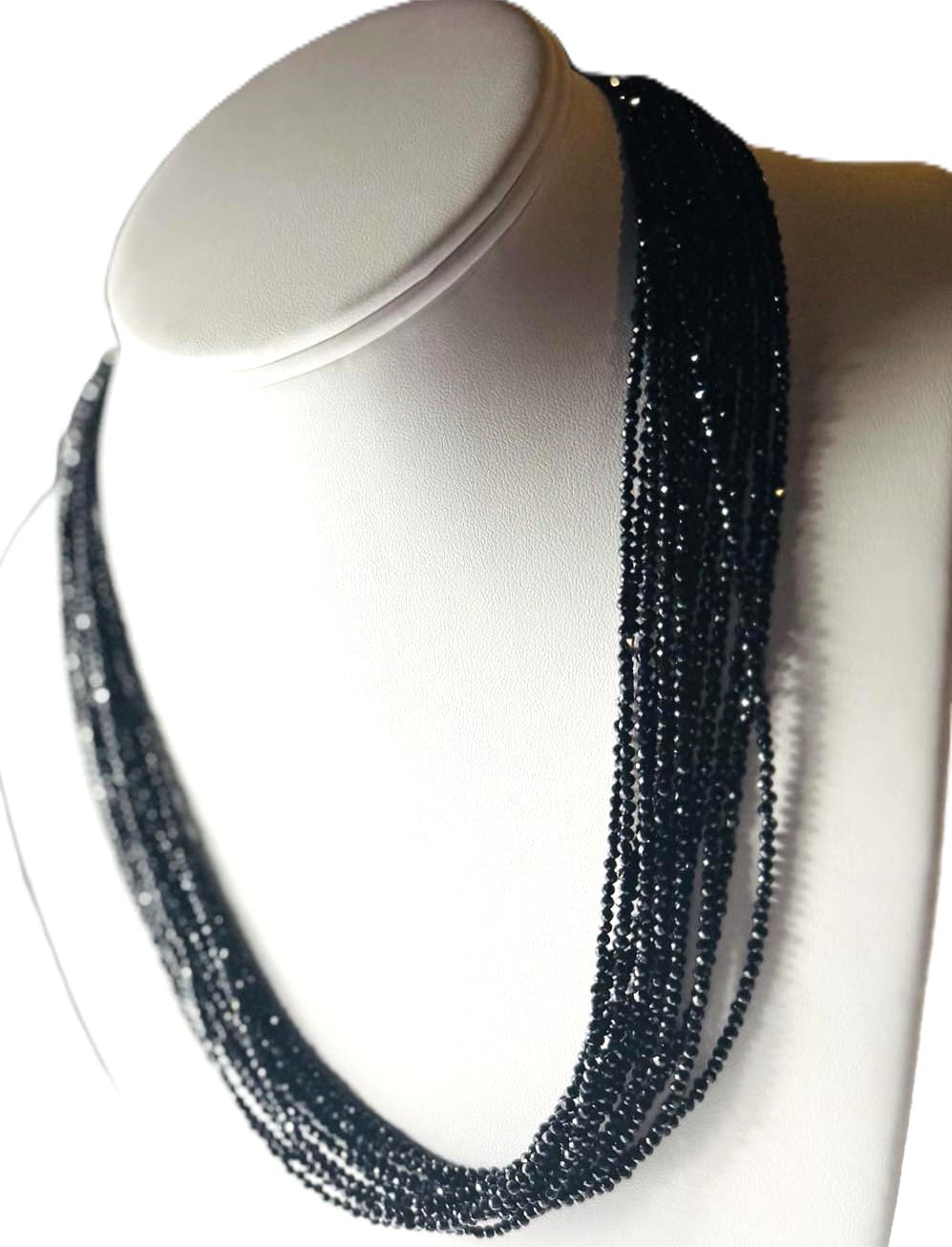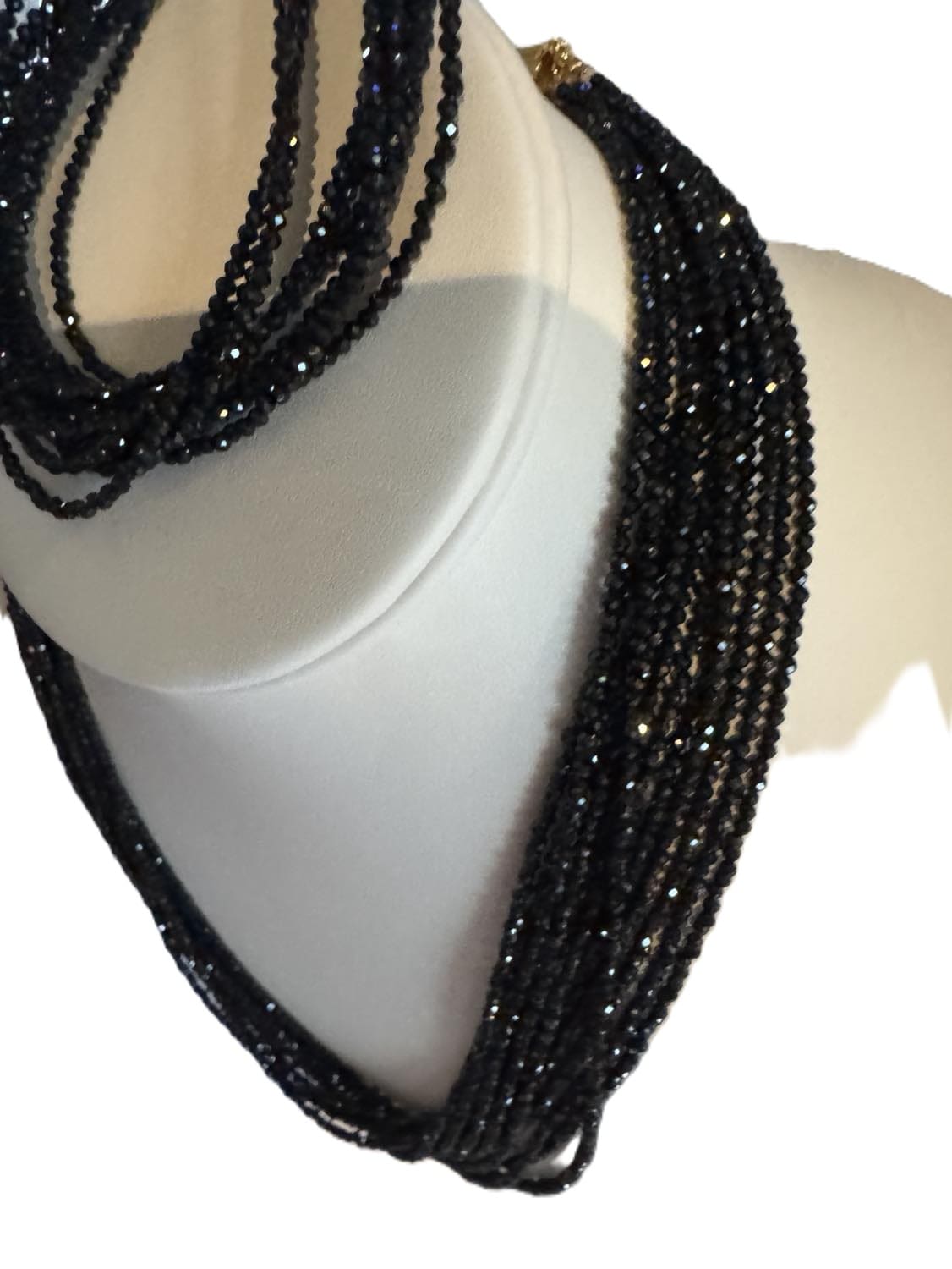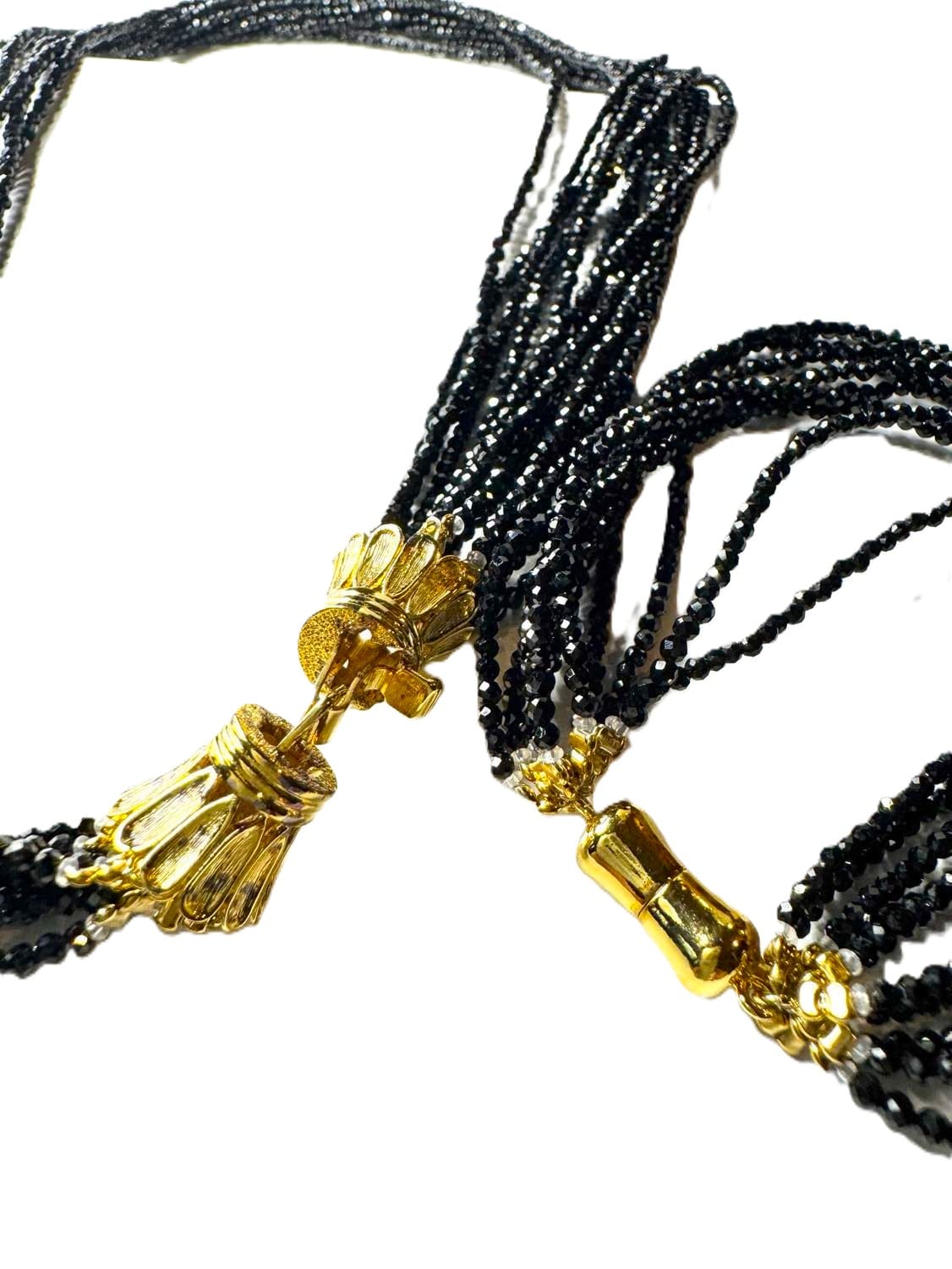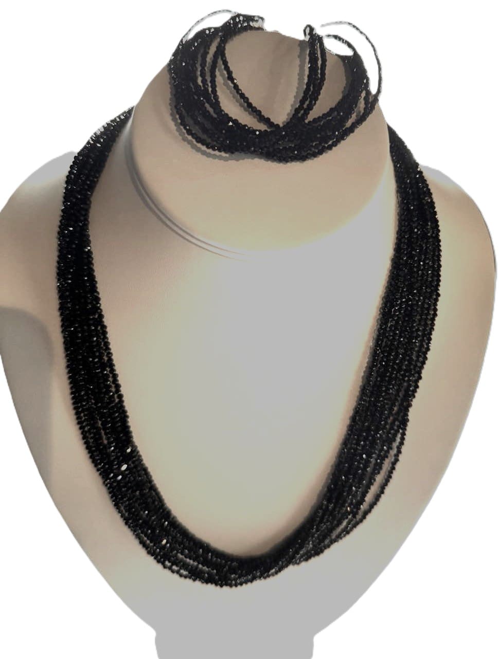 Beautifully bold, necklace features an impressive show of a whole black spinel 10/12 strands that add drama to any outfit. Set in sterling silver with gold plating. This necklace has French backing that could be worn in front. Necklace length is 20.5 inches, bracelet has magnetic closure , size 7.