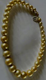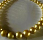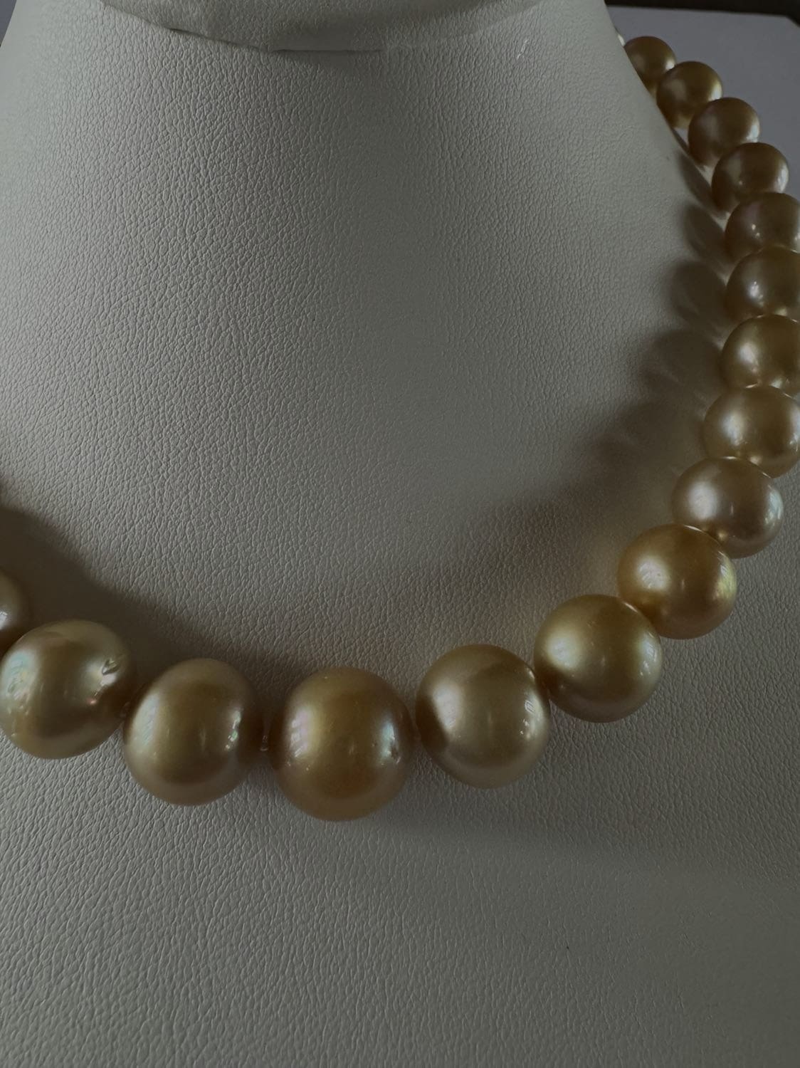 Here’s a golden opportunity to add a classic strand of pearls to your jewelry collection! Glowing with 12-14mm golden cultured South Sea pearls in a continuous line, this exceptional necklace is an elegant go-to for any formal occasion. Silver yellow gold ball clasp. Golden South Sea pearl necklace. South Sea pearls are unique and may vary in sizes. Weighs 89.8 grams, 18 inches in length.