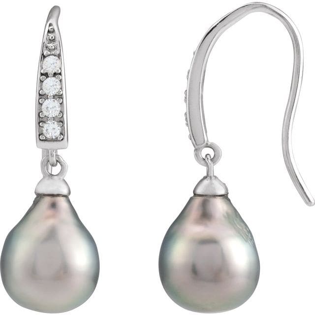 Rhodium-Plated Sterling Silver Cultured Gray Tahitian Pearl & Imitation White Cubic Zirconia Earrings