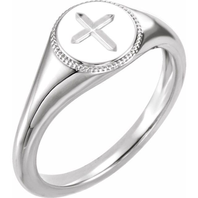 14K White 5x3 mm Oval Youth Cross Signet Ring